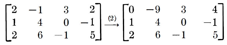 여기에 elementary row operation을 적용해보겠습니다. (2) 번을 적용하고 결과를 볼 텐데, 2번째 행에 2를 곱한 뒤 1번째 행과 빼주면 아래와 같아집니다.