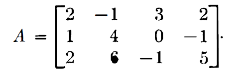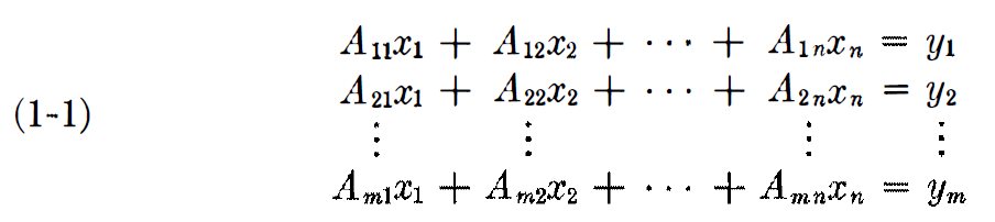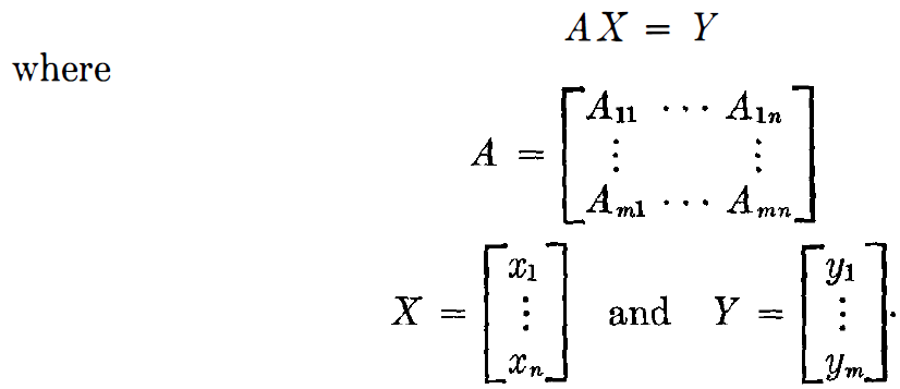 A 를 system의 matrix of coefficients 라고합니다. 분명하게 말하지만, 위에 보여진 사각 형태의 array는 행렬 이 아닙니다. 다만 , 그 형태를 빌려올 뿐이죠. field F 에 대한 m x n matrix은 ineteger ( i, j ) pairs의 set으로 부터 파생된 function A 입니다. matrix A의 entries는 A(i,j) = A_ij 이고, 이를 보기 편하게 나타나기 위해 m개의 행과, n개의 열을 가진 행렬의 형태로 나타냅니다. 이에 비슷하게, X 는 n x 1 matrix으로 Y는 m x 1 matrix으로 정의 될 수 있죠. 이 system은 간단히 AX= Y로 표현하겠습니다. 위의 matrices에 대해 multiplication을 정의 할때, Y는 A와 X의 product를 의미한다고 하겠습니다.