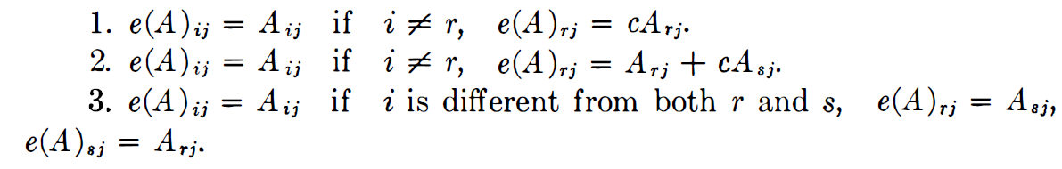 위 의 증명은 간단하게 c와 c^-1 scalar를 이용 해서 곱하고 더하고 바꾸면 같은 A를 만들 수 있음을 설명하는 겁니다. 위에 쓰여진 1,2,3,은 elementary row operation의 세 가지 type이죠. 위의 Theorm 2를 토대로 Definition이 나옵니다.