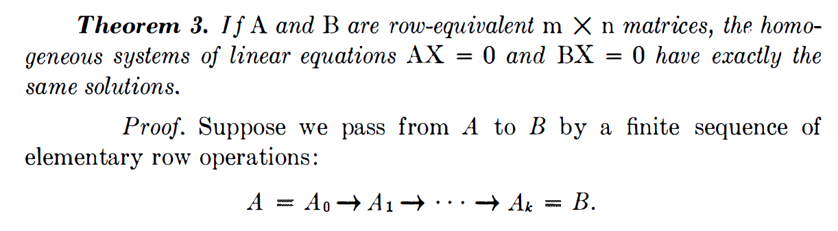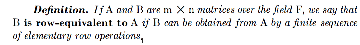 이 정의는 B 가 elementary row operations을 활용해 A로 부터 얻어 질수 있는 m x n matirx 이라면 B는 A에 row-equivalent하다는 것을 나타냅니다. 다음 나오는 Theorm 3입니다.