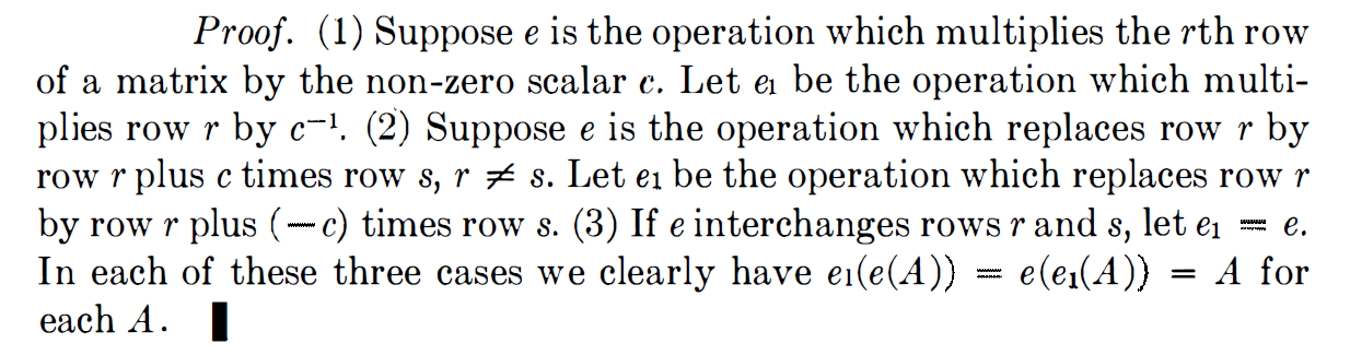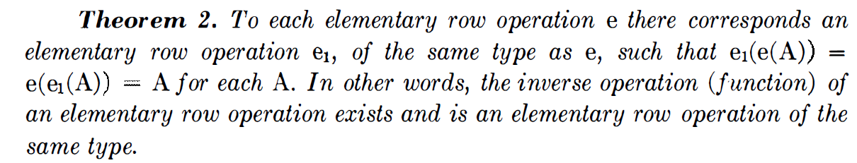 잠깐 볼까요? 각 elementray row operaion e는 elementary row operation e1 에 해당한답니다. 즉 e_1(e(A)) = e(e_1(A)) = A 를 만족하죠. elementary row operation은 inverse operation이 존재하고, e 와 같은 타입니다. 증명에 대해 설명하지는 않겠지만 참고하실 분들은 아래의 그림을 봐주세요.
