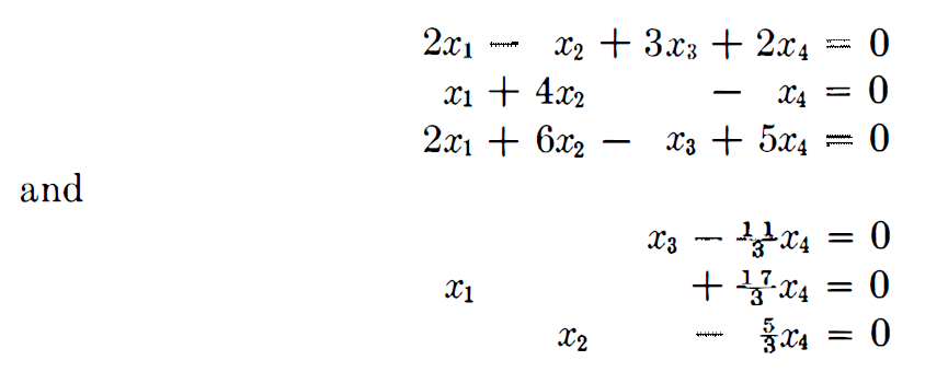 2 번째 system과 1 번째 system은 정확히 일치하며, 2 번째 system을 통해 ( -17/3 c, 5/3, 11/3c, c )라는 solutoin을 얻을 수 있죠.
