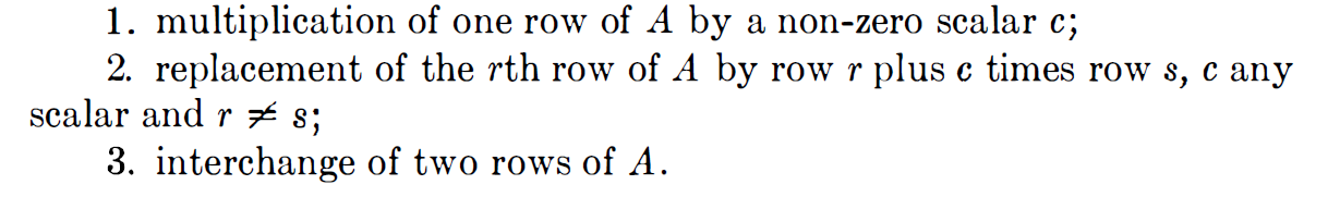 이제 matrix A 의 row에 대한 opertaions를 고려해보죠. 이는 AX=Y에서 equations의 linear combinations를 form하는 것과 관련이 있죠. field F에서 m x n matrix A 에 대해 아래의 3가지 elementary row operation에 집중해봅시다.