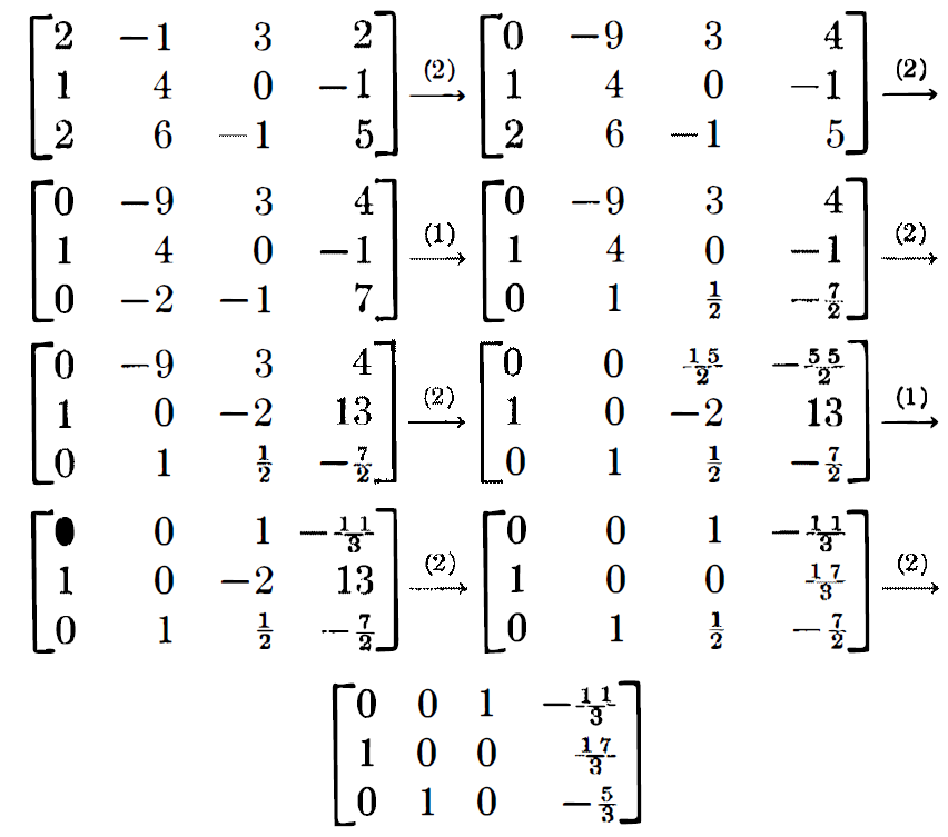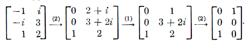 이번에 역시 elementar row operation을 3 행을 기준으로 적용해서 1 행과 2 행에 더해주는 과정을 거치고 1번 째 행에 대하여 ( 2-i )/3 를 곱해주는 1 번 연산을 적용하고 해당열을 이용해 정리하면 아래와 같은 과정을 얻을 수 있죠.