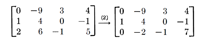 여기에 elementary row operation을 적용해보겠습니다. (2) 번을 적용하고 결과를 볼 텐데, 2번째 행에 2를 곱한 뒤 1번째 행과 빼주면 아래와 같아집니다.