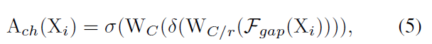 F_gap( X ) = 1/WH*( SIGMA (X_i,h) ) 는 channel-wise global aberage pooling 이고 W_C/r, W_C 는 두 개의 fully-connected layers의 weights이죠. delta는 ReLU non-linear operator를 뜻하고, sigma는 sigmoid function을 나타내죠.