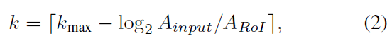 여기서 k_max는 feature map의 last level입니다. A_input과 A_RoI는 input image와 RoI를 각각 나타내죠. 표준적인 size 224 없이 Equation 2에서는 RoI pooling scale이 input/RoI area의 ratio로 adaptively하게 할당되죠. 만약 k가 minimum level 보다 작다면 k 는 minimum levle로 고정되죠. 구체적으로, 만약 RoI의 area가 input area의 반보다 크다면, RoI는 highest feature level에 할당됩니다. 뒤집어서, Equation 1은 P_4에 RoI 224^4를 할당하죠. Equation2는 k_max-5 level을 결정하죠. 이는 RoI의 area에 대한 가장작은 feature level일 겁니다. input size보다 20x 이상 작은 size죠. 저자들은 proposed RoI assignment method는 small object AP를 Equation 1보다 향상시켰다는 것을 알아낼 수 있었죠. 왜냐면 adaptive 하고 scale-aware assignment strategy 때문이죠.