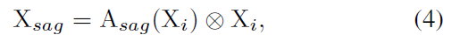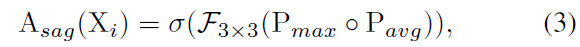 여기서 sigma는 sigmoid funtion을 나타내죠. F_3x3 은 3 x 3 conv layer를 나타내고 o 는 concatenate operation을 나타냅니다. 마지막으로 attention guided feature map X_sag ( C x W x H )는 아래와 같이 계산됩니다.