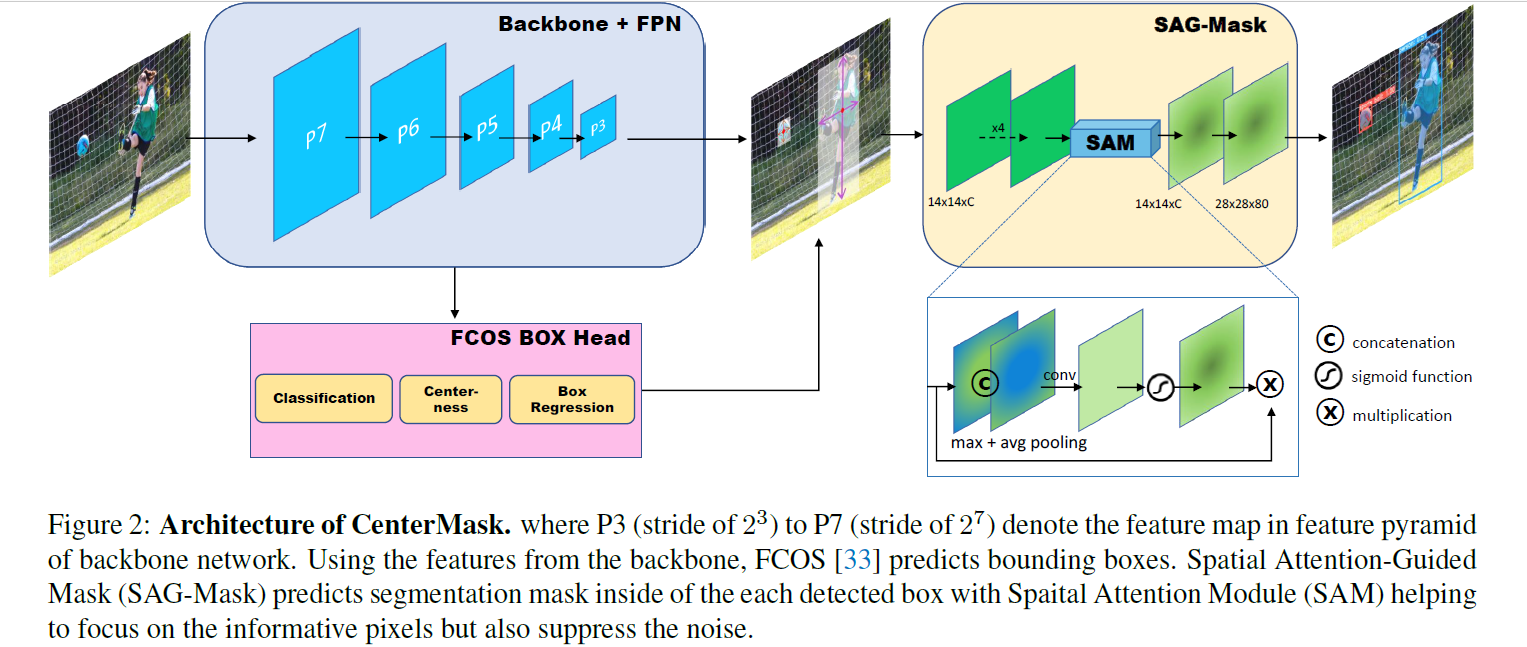 FCOS에 붙여서, 저자들의 spatial attention-guided mask ( SAG-Mask ) branch는 FCOS detector로부터 예측된 boxes를 input으로 취하고 각 Region of Interest ( RoI )별로 segmentation masks를 예측하죠. spatial attention module ( SAM )은 mask branch가 meaningful pixels 에 집중하고 uninformative pixels는 제외하도록 돕죠.