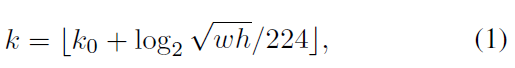 object proposals가 FCOS box head에서 예측되어진 후에, CenterMask가 segmentation masks를 예측하는데요. 이때 predicted box regions가 사용되고 Mask R-CNN과 같은 맥락을 따르죠. RoI는 FPN에서 다른 level의 feature map으로부터 예측되어지는데, feature를 extract하는 RoI Align은 RoI scales를 고려하여 feature maps의 다른 scales에 할당되어야 하죠. 구체적으로, large scale을 가진 RoI는 higer feature level에 할당되어야 합니다. Mask R-CNN은 two-stage detector에 기반하고 FPN에서 Equation1을 사용합니다.