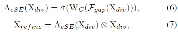 그럼으로, 저자들은 eSE 를 제안합니다. 하나의 FC layer만을 사용하죠. 이는 channel dimension reduction을 없애기 위함이죠. 그렇게 해서 channel information을 유지하고 성능을 향상시킵니다. eSE는 아래와 같이 정의되죠.
