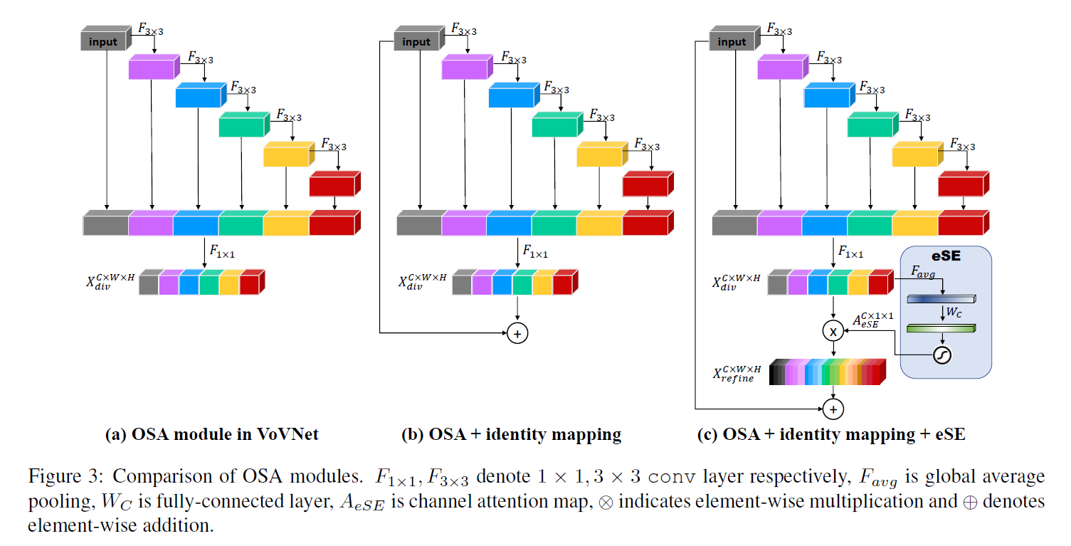 여기서 X_div 는 diversified feature map 이고 1x1 conv에 의해 계산되죠. channel attentive feature descriptor, A_eSE 는 diversified feature map X_div에 적용되는데 이는 diversified feature 이 더 informative 할 수 있도록 하기 위함이죠. 마지막으로 residual connection을 사용할 떄, input feature map은 element-wise로 X_refine 에 더해집니다. X_refine은 refined feature map을 의미하고요. 어떻게 OSA module에 eSE가 더해지는 지는 Figure 3(c)에서 보여줍니다.