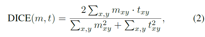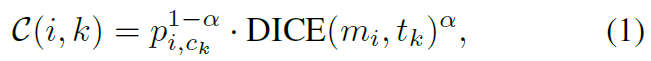 alpha는 hyper-parameter이고 이는 classification과 segmentation의 impacts를 balance하고 0.8로 set합니다. c_k는 k-th gorund-truth object에 대한 category label이고 p_i,c_k는 i-th prediction의 category c_k에 대한 probability를 나타내죠. m_i와 t_k는 i-th prediction의 masks와 k-th ground-truth object 를 각각 말합니다. dice coefficient는 Eq(2)에서 정의되어 있습니다.