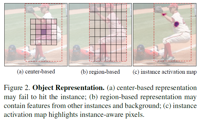 이 논문에서 저자들은 real-time instance segmentaion에 대해 새로운 highlight to segment paradigm을 제안합니다. object를 represent하는 boxes나 centers를 사용하는 대신, instance activation maps( IAM )의 sparse set을 사용합니다. IAM은 informative object regions를 highlight하죠. 이는 CAM에서 영감을 받았는데 weakly-supervised object localization에 광범위 하게 사용되는 방법이죠. instance activation maps는 instance-aware weighted maps인데요 instance-level features는 highlighted regions에 따라 직접 aggregated 될 수 있죠. 그런 다음, recognition과 segmentation이 instance features에 기반해 수행되죠. Figure2는 region-based, center-based, IAM-based representations를 비교합니다.