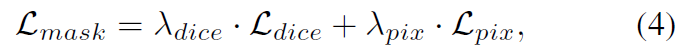 여기서 L_dice와 L_pix는 dice loss와 binary cross entropy loss이고 lambda_dice 와 lambda_pix는 coefficients에 해당하죠.