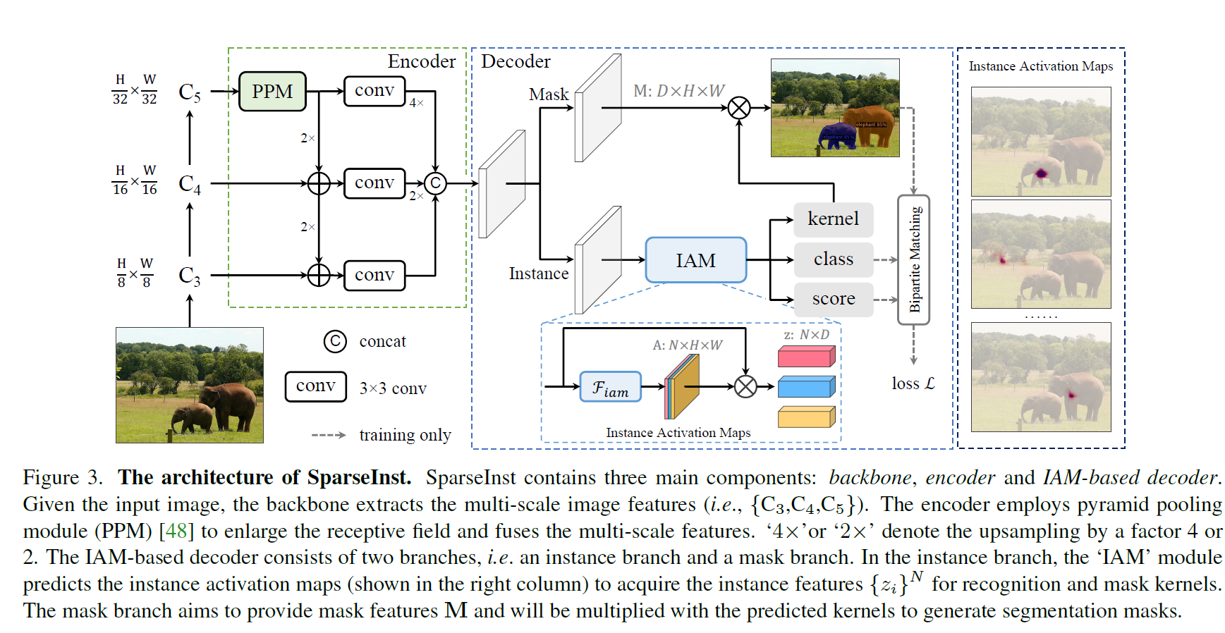 Figure 3에서 설명하다시피, SparseInst는 간단하고 압축적이며 공통된 framework이죠. backbone과 instance context encoder 그리고 IAM-based decoder로 구성되어있습니다. backbone network는 ResNet 등의 예가 있으며, multi-scale features 를 주어진 이미지로부터 추출하죠. instance context encoder는 backbone에 붙여지는데 more contextual information을 강화하고 multi-scale features를 fuse하기 위함이죠. faster inference를 위해, encoder는 single level features를 출력으로 주죠. 이는 input image에 대해 1/8 x 의 resolution을 가집니다. features는 IAM-based decoder에 입력으로 주어지고 classification과 segmentation을 위한 foreground objects를 highlight하는 instance activation maps를 generate합니다.